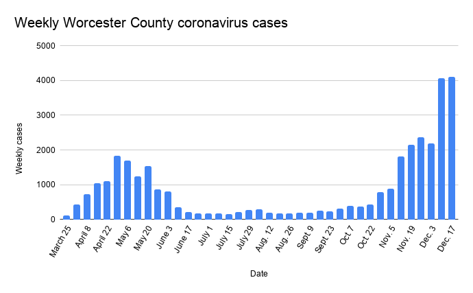 New COVID-19 cases in Worcester County set another weekly record on Thursday, surpassing 4,000 for the second straight time.