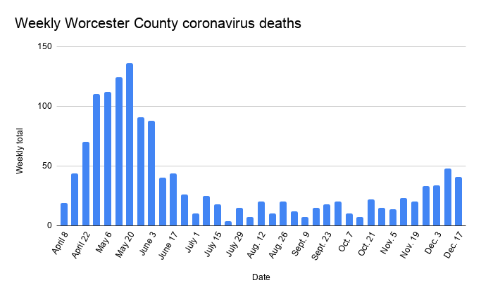 Deaths haven’t risen to nearly the same rates as during the state’s spring peak, even as deaths have hit all-time highs nationally, including more than 3,600 on Wednesday. New deaths in the past week in Worcester County totaled 41, a slight drop from the previous week, with a total that now stands at 1,384 since the pandemic began. Massachusetts has recorded 349 new deaths in the past week, with a new total of 11,558.