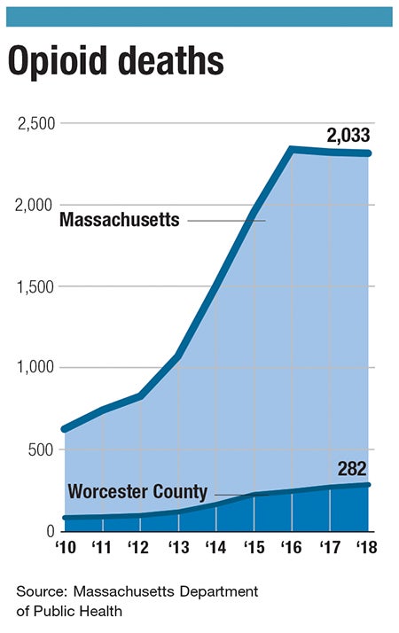 Opioid-related deaths in Worcester County have spiked this decade, from 79 in 2010 to 282 in 2018, according to the Massachusetts Department of Public Health. The county has a slightly disproportionate share of the state’s opioid deaths, accounting for more than 14% of its overdoses but 12% of its population.