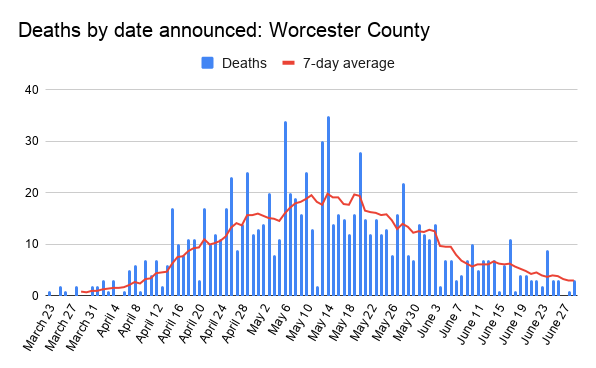 Fatalities within Worcester County contribute to the 924 recorded since the beginning of the pandemic. Statewide, there were 35 confirmed coronavirus deaths Monday, adding to the 8,095 total.