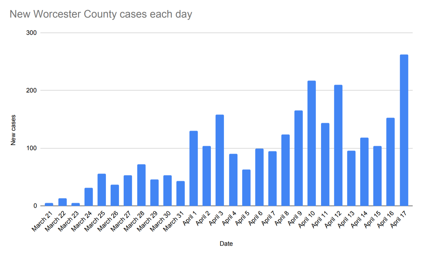 Friday easily marked a new high for a single-day increase in coronavirus cases in Worcester County with 262, according to the Massachusetts Department of Public Health.