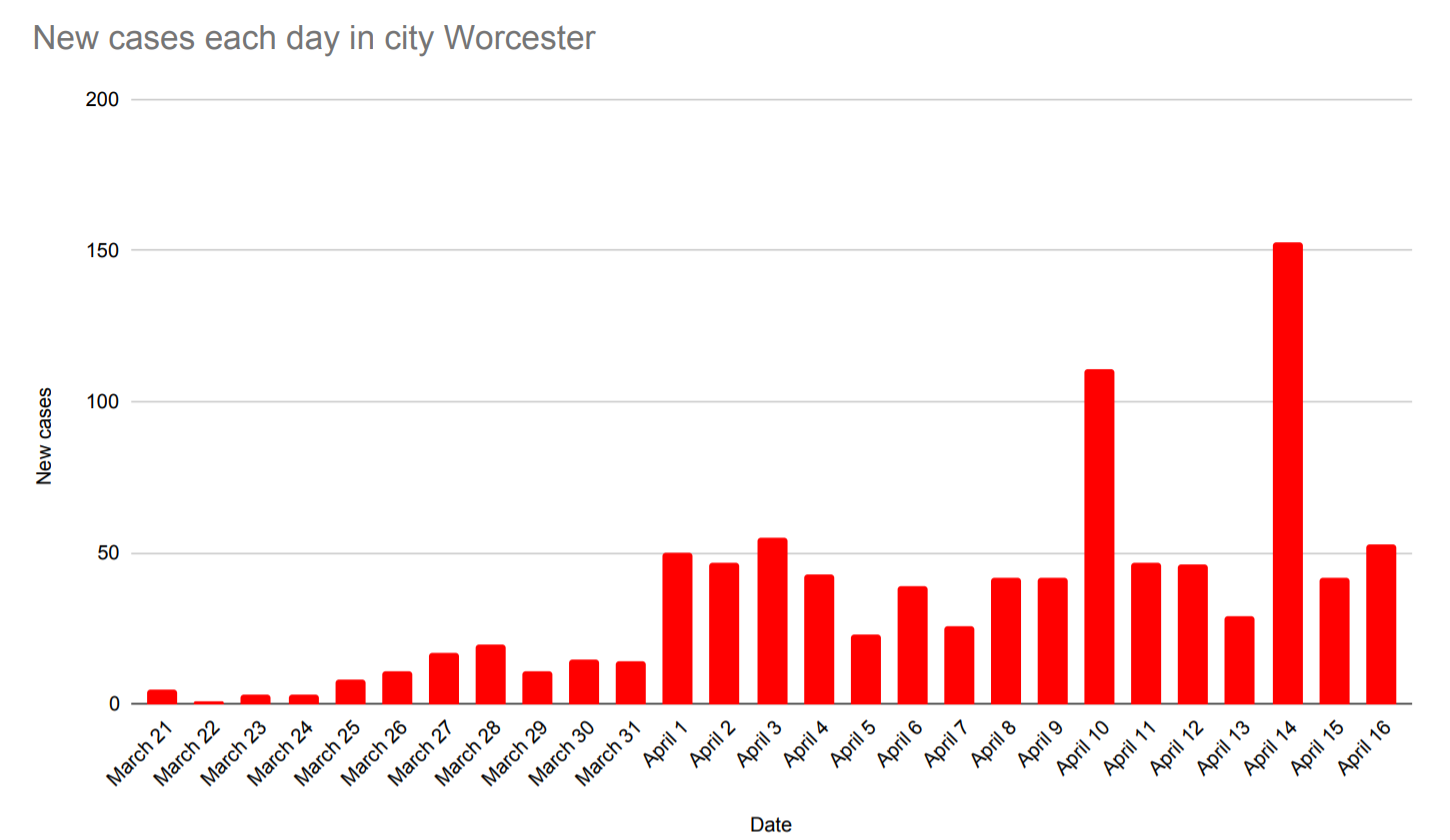 The City of Worcester announced 1,067 total cases as of Thursday, up 104, or 11%. City officials also announced for the first time an outbreak at St. Mary Health Care Center, a retirement care community, which has 33 total patient cases and 18 employee cases.