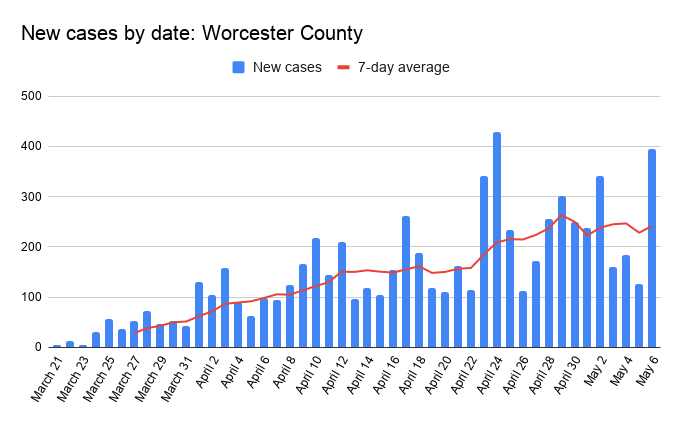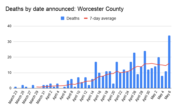 Worcester County has seen the largest reported increase in coronavirus deaths with 34 fatalities on Wednesday and 395 new cases, according to Massachusetts Department of Public Health data.