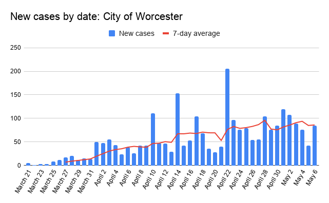The city of Worcester has seen an increase in cases Wednesday, with a 3% rise compared to Tuesdays 2% change. There were a reported 84 new cases contributing to Worcesters overall of 2,588.Â