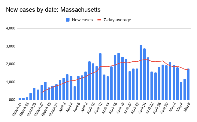 The new cases in Worcester County saw the largest increase since April 24 with a 6% rise, which added to the now total 6,992 cases. Across Massachusetts, cases rose by 1,754, or 2% bringing the total to 72,025. The daily rise in cases statewide continue to stay relatively low compared to the reports in April.Â