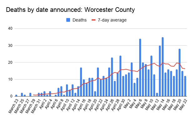 The new fatalities in Worcester County increased the total death count to 652, and there were a reported 80 new deaths in Massachusetts increasing the total to 6,228.