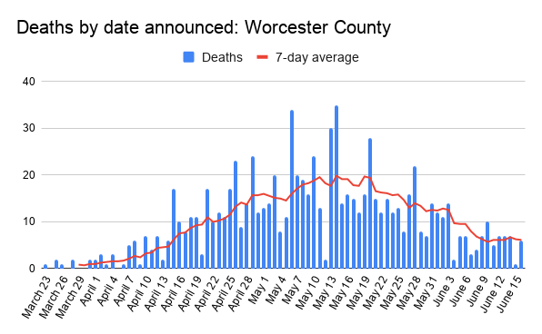 New daily coronavirus fatalities in the state continue to decline with 18 new deaths Tuesday. The new deaths follow Monday’s 23 fatalities and Sunday’s 48, bringing the overall death toll to 7,665 in the state. Throughout Worcester County, the new deaths bring the total to 877.