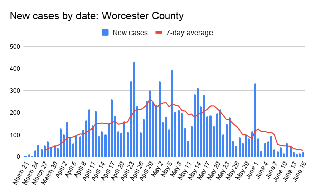 The new cases in Worcester County bring the total to 12,014 since the pandemic began. That tally exceeds that of 18 entire states, according to the U.S. Centers for Disease Control and Prevention.