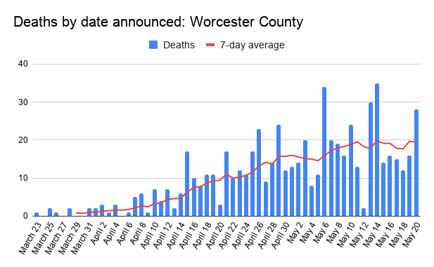 The county had 28 newly reported deaths Wednesday, according to the Massachusetts Department of Public Health, bringing the tally so far to 625. Worcester County’s 9,780 coronavirus cases through Wednesday are the state’s fourth highest of 14 counties. Middlesex County has the most at 19,708, followed by Suffolk and Essex counties.