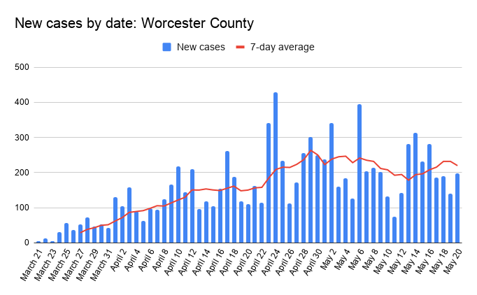 The city of Worcester had 105 new cases Wednesday, bringing the city’s total to 3,661.