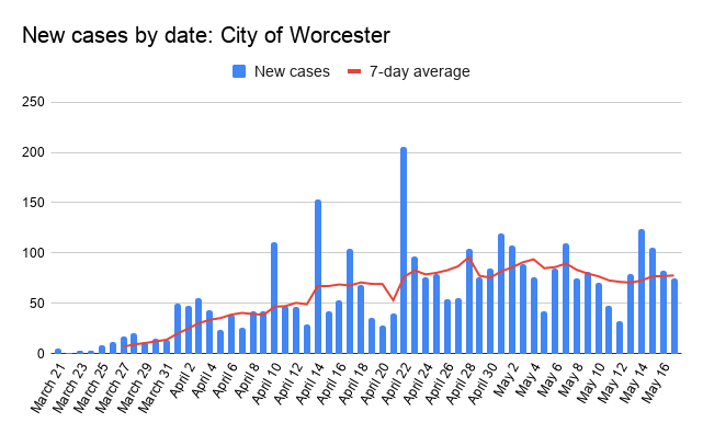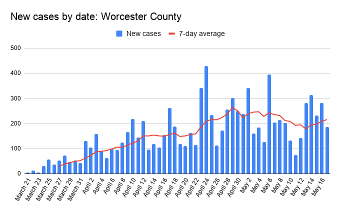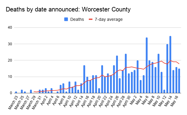Worcester County cases have shown a slight downward trend since a seven-day average in cases peaked April 29. But the nearly three weeks since then have not been a smooth downward line and have been marked by sporadic increases in cases or deaths, and cases remain at a generally higher level more than halfway through May than the county saw through most of April.
