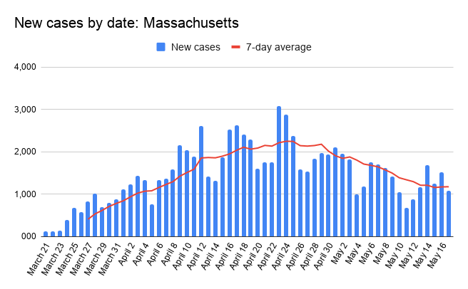 Massachusetts cases peaked on a seven-day rolling average on April 24.
