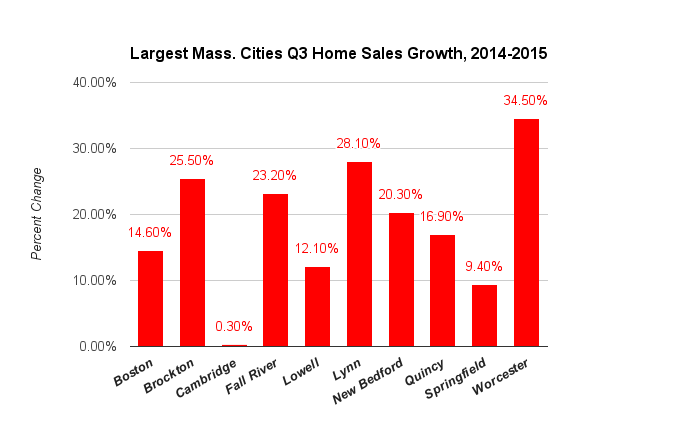Worcester led the way in a surge of home sales across the state that saw the city surpass all other cities with 34.5 percent year-over-year growth, according to a report from The Warren Group.