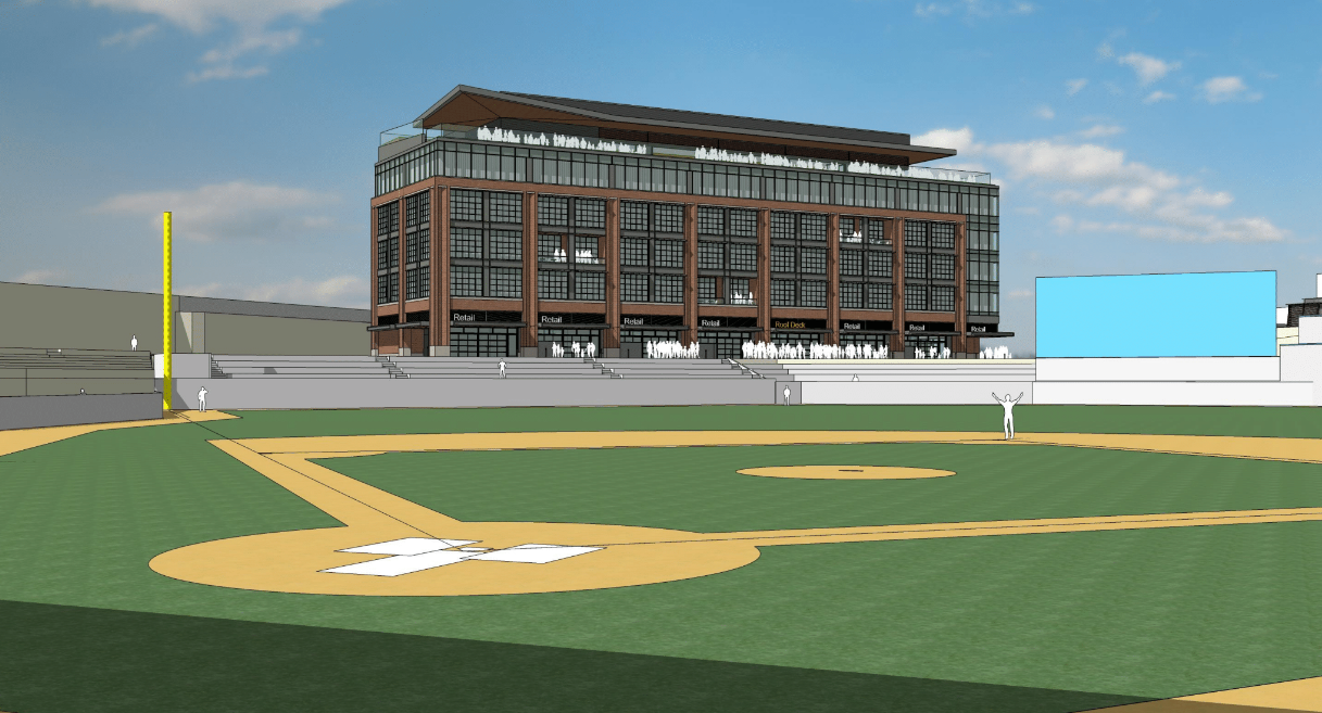 Right field will be boarded by Table Talk Pies and other buildings along Green Street, while left field will be boarded by Plymouth Street and a proposed six-floor, 121,000-square-foot office building and underground parking garage with about 125 spaces, featuring a roof deck overlooking left field.Â