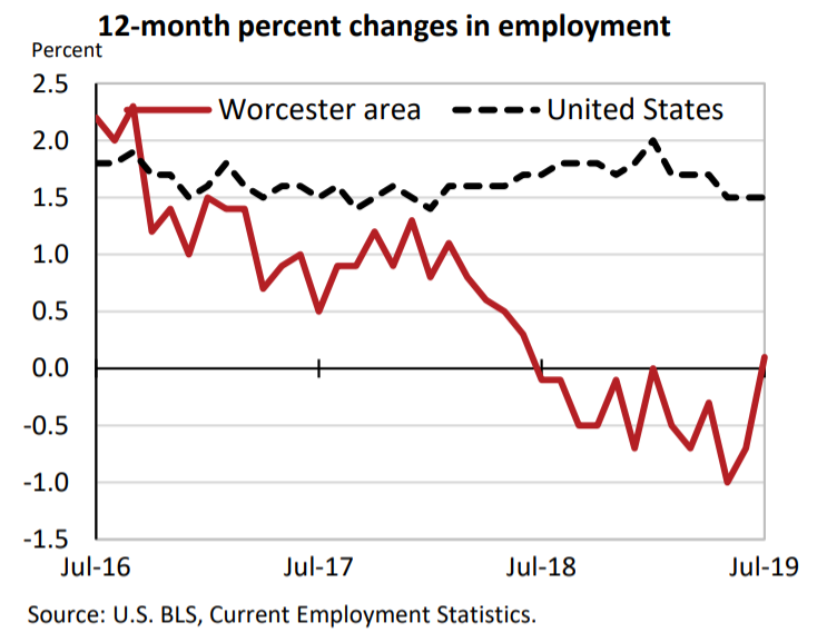 The new workforce numbers come at a time of increased speculation among economists of a slowdown in the economy of even a recession in the next year or two. Non-farm employment changes in the Worcester metro area have trailed the national average for nearly three years, with the gap widening in the past year and a half.