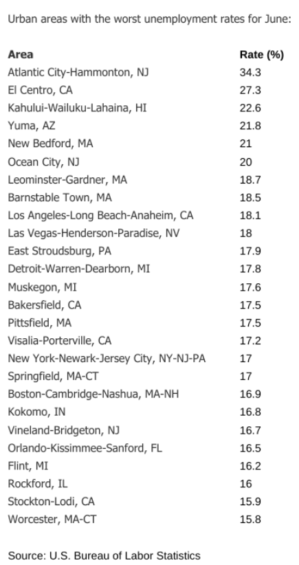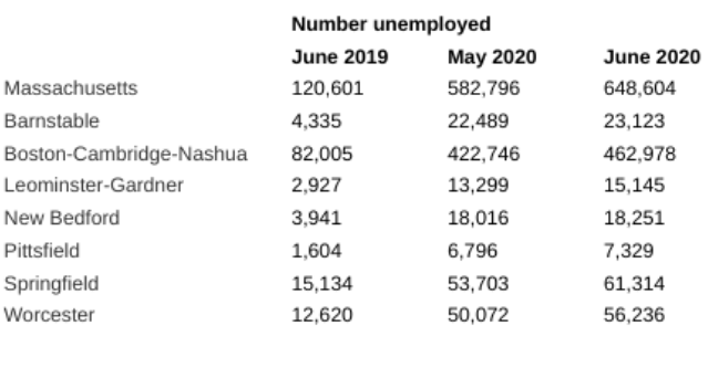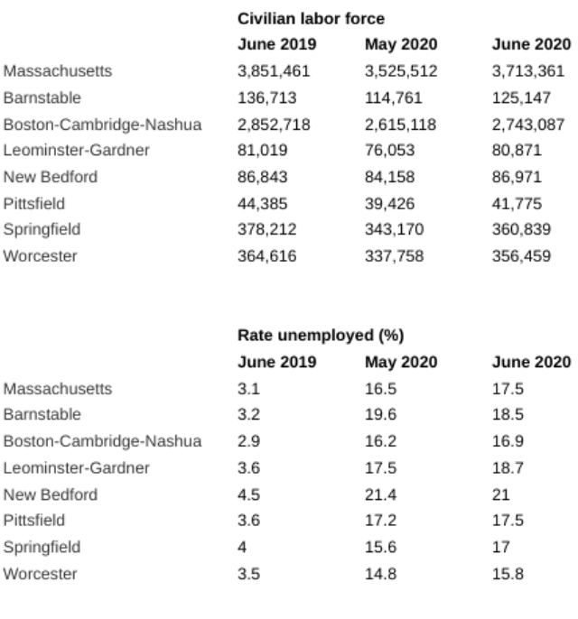 The region’s 15.8% unemployment rate is an improvement over the statewide rate of 17.5%, but the Massachusetts rate in June was the worst in the country, with the state having taken more dramatic steps than most to keep business operations limited during the coronavirus pandemic. The national unemployment rate for June was 11.2%.