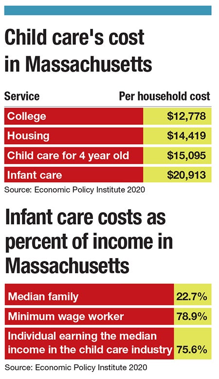 Issue one is the affordability of child care in Massachusetts, said Farnitano. Costs here are some of the highest in the nation; Massachusetts is ranked as the second most expensive state for child care by the left-leaning think tank Economic Policy Institute in Washington, D.C. The average annual cost of child care for a 4 year old costs $15,095; infant care is $20,913, according to EPI.