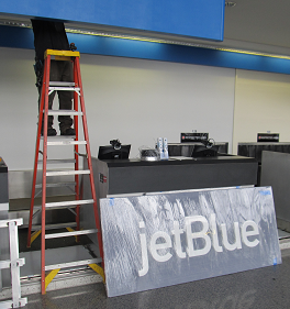 Late last week, workers were preparing the airport concourse with JetBlue signage.