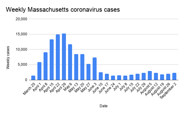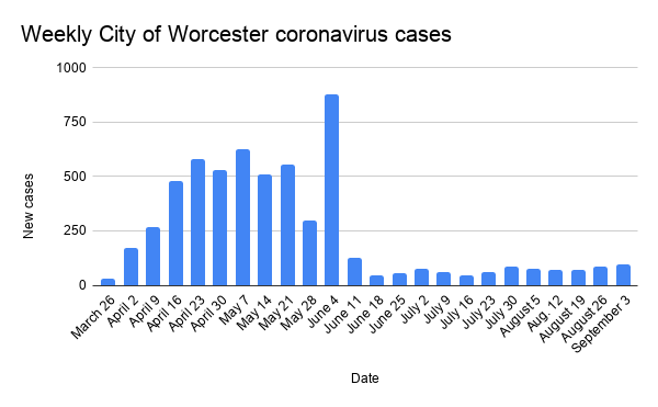 The city of Worcester has had 98 new coronavirus cases in the past week, its highest number since early June, showing a rise in cases just as most colleges are beginning their fall semester.