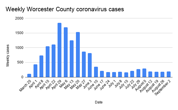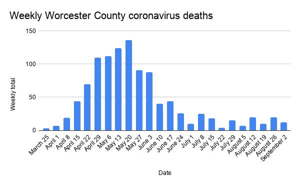 Worcester County has recorded 191 new coronavirus cases and 12 fatalities in the past week, according to the Massachusetts Department of Public Health.
