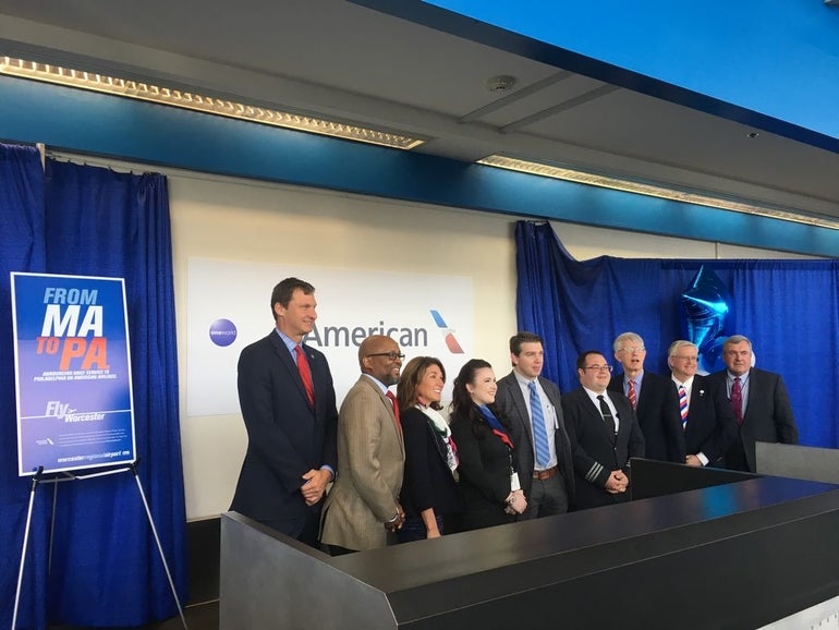 Twice-daily flights from Worcester to Philadelphia via American Airlines will begin Thursday.