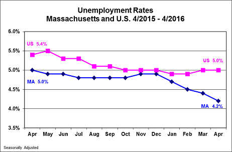 Although all areas of the state saw a decline in unemployment, down to 3.9 percent for April, the largest gains for the state were in the Boston-Cambridge-Newton, Springfield, Barnstable, Worcester and Lowell-Billerica-Chelmsford areas. Worcester’s unemployment dropped by nearly a percentage point year-over-year from 5.1 percent last April.