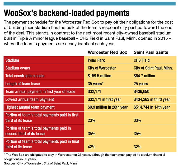 When the cost of Polar Park rose to $160 million in January, the WooSox agreed to extend their obligation to stay in Worcester from 30 year to 35 years, although the payment schedule runs for only 30 years. This is because the team must pay off its portion of the stadium costs within 30 years. After that is complete, the city and the team will have to negotiate a rent payment for those last five years, said Augustus, who added those negotiations are unlikely to occur while he is city manager.