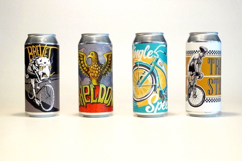 The first five beers to be released in cans: Sheldon Brown Ale, with label design by Aaron White; Trackstand Pilsner, with label design by Scott Boilard; Single-Speed Pale Ale, with label design by Derek Ring; Brevet IPA, with label design by Adam Cutler; and Hilltopper Belgian Blond Ale, with label design by Tia Kinsman.