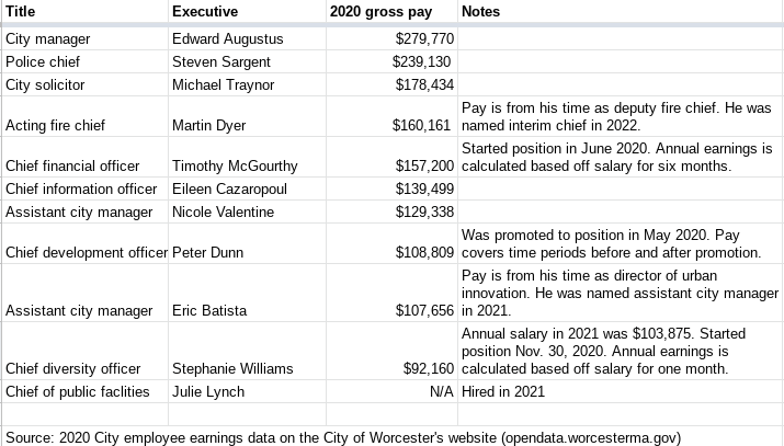 City Solicitor Michael Traynor, Acting Fire Chief Martin Dyer, Chief Financial Officer Timothy McGrouthy, and then-Chief Information Officer Eileen Cazaropoul all made salaries between $139,500 and $178,500 in 2020.