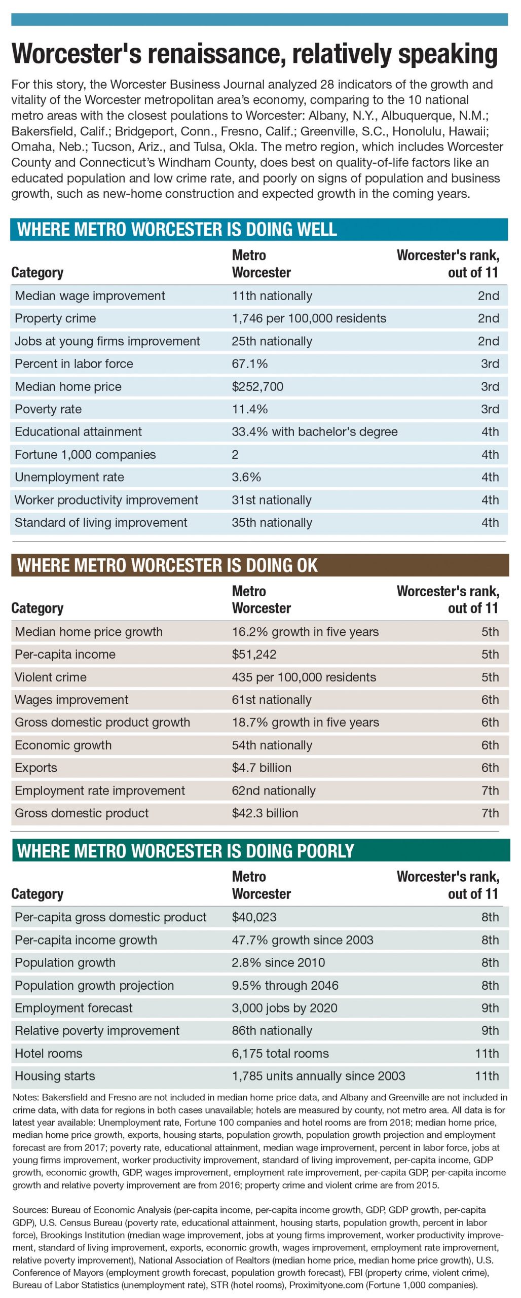 Metro Worcester’s growth and prosperity compared to the 10 closest-sized regions by population nationally can temper the heightened talk of Greater Worcester’s full-blown renaissance, according to a Worcester Business Journal analysis of 28 indicators of the economy and quality of life.