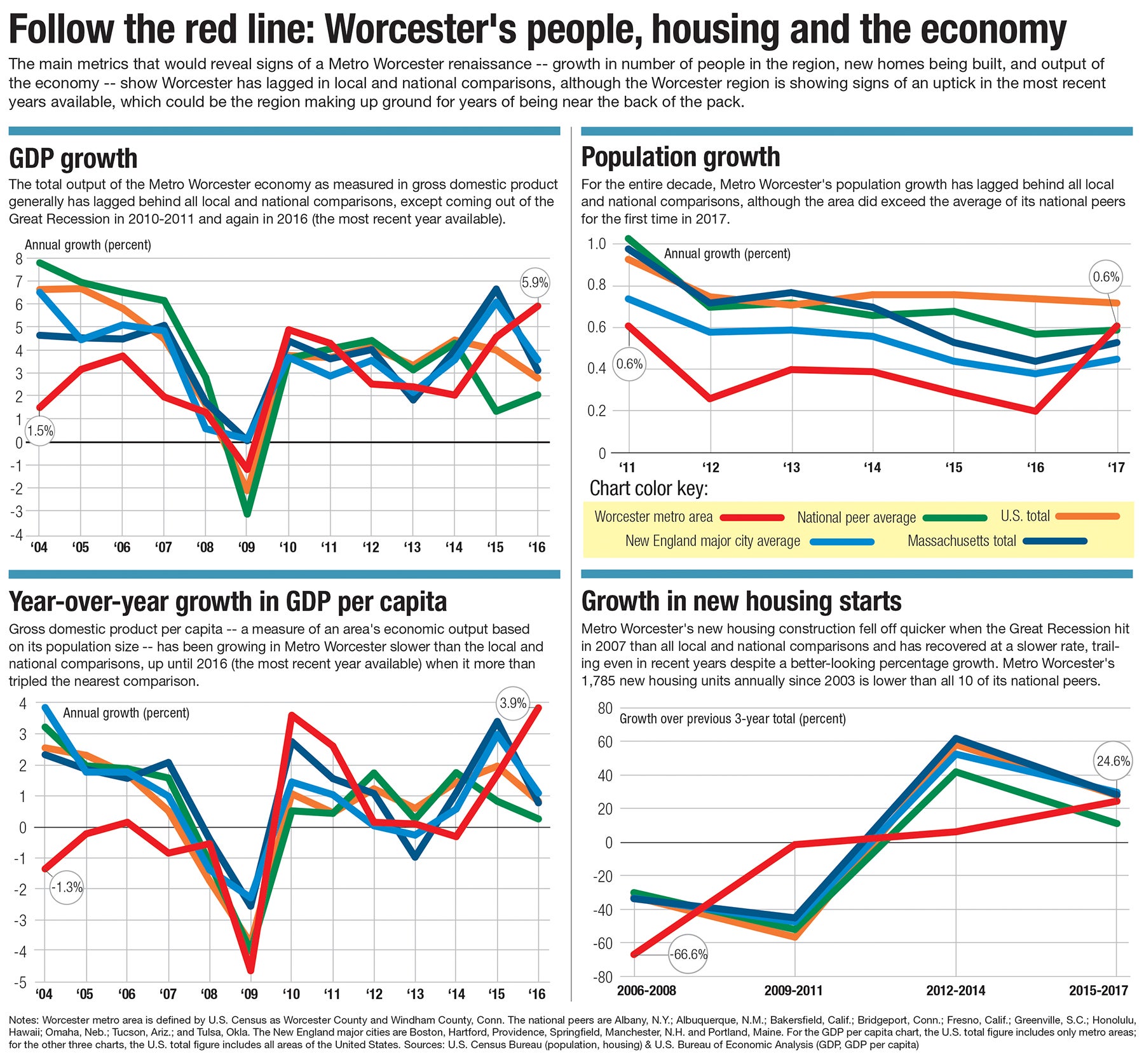 In the most recent one-year data, Metro Worcester is outpacing the average of its 10 national peers in key areas: 6 percent vs. 2 percent in GDP growth; 9 percent vs. -4 percent in new housing starts; and 0.61 percent vs. 0.59 percent in population growth.