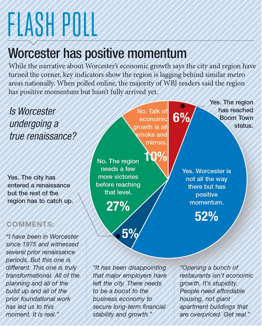Much of the talk around the so-called Worcester renaissance isn’t comparing the metro region to national peers, the state average or even other New England cities like Springfield and Hartford. Much of the buzz around Worcester revolves around the fact that Worcester – yes, that Worcester with its longheld rundown reputation – isn’t what some people remember from another era, with notable new restaurants and a mix of uses where the Galleria mall once stood downtown.