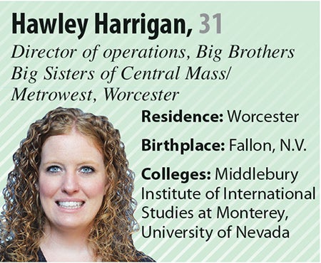 In 2014, Harrigan moved to Worcester here from California to work with Big Brothers Big Sisters of Central Mass/Metrowest and has since volunteered with the United Way of Central Mass, Regional Environmental Council, Community Harvest Project and Kaya Children International. Hawley works as a public administration professor at Clark University.