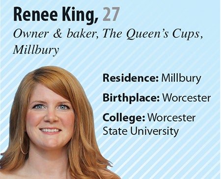 Five months after graduating with a psychology degree, King went out on a whim and opened a Millbury bakery, transforming it into a gourmet cupcake shop and catering service. It is a vendor at prominent wedding venues Tower Hill Botanic Gardens and Crompton Collective. The shop received Best Bakery (2014) and Best Desserts (2014, 2015) awards from the Millbury Sutton Chronicle and Best Cupcakes (2016) by Worcester Magazine. King is 2016’s WSU Outstanding Young Alumna.