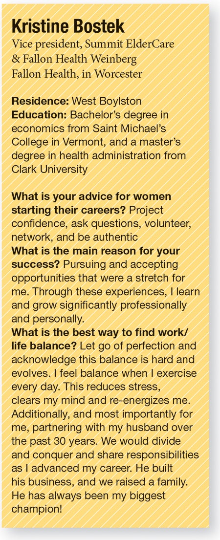 As vice president of Summit ElderCare at Fallon Health in Worcester, Bostek is tasked with managing a unique program known as PACE, a Program for All-Inclusive Care for the Elderly.