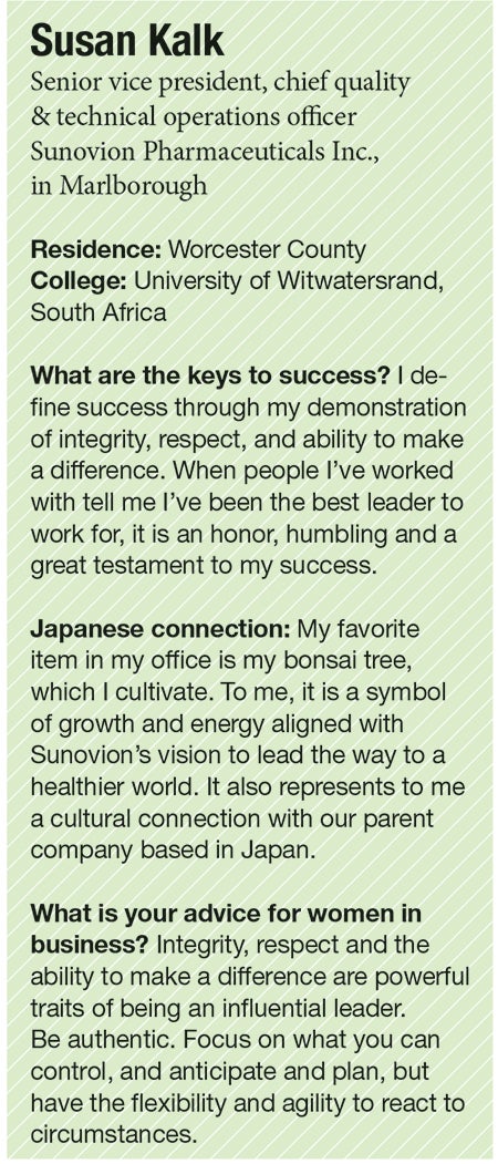 Kalk later worked for Amgen, a biomanufacturing laboratory in Rhode Island, before joining the pharmaceutical company Sunovion in Marlborough in 2015. Today, she’s one of Sunovion’s senior vice presidents and its chief quality and technical operations officer. Her job entails a lot of meetings: with the executive team, with her own department, and one-on-one sit-downs with staff.