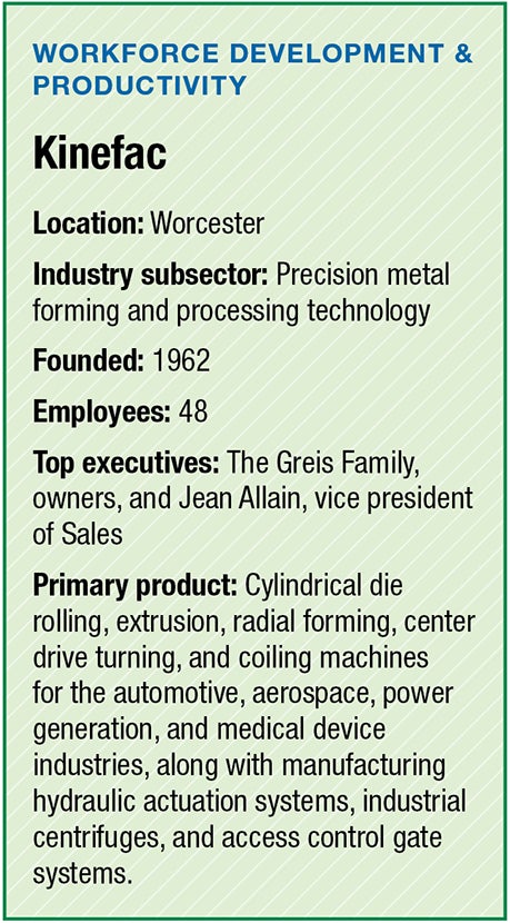 More than 60 years after Howard Greis opened Kinefac, the Worcester-based metal forming manufacturing firm still works to maintain the same entrepreneurial and collaborative company culture instilled by Greis in 1962.