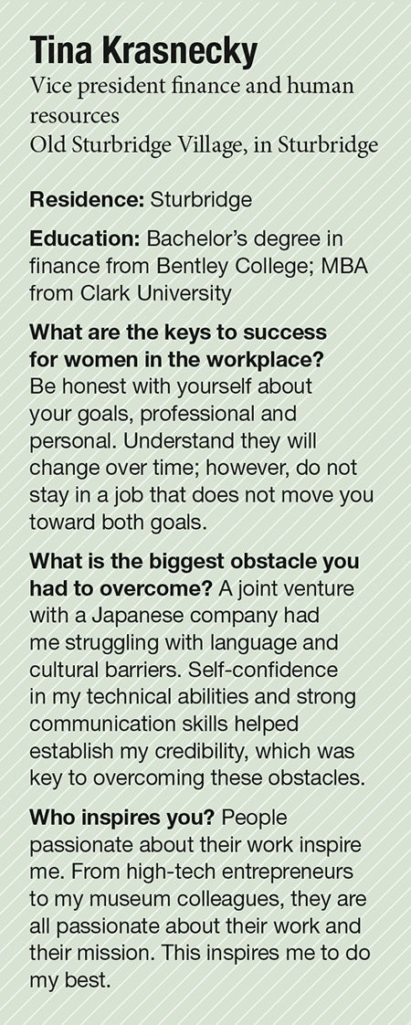 Many of us have been on field trips to Old Sturbridge Village, including Tina Krasnecky. From those early experiences, today she is the organization’s vice president, finance and human resources – her first role in a nonprofit – following a career that took her through multinational high-tech businesses, a company spinoff, and entrepreneurial startups.