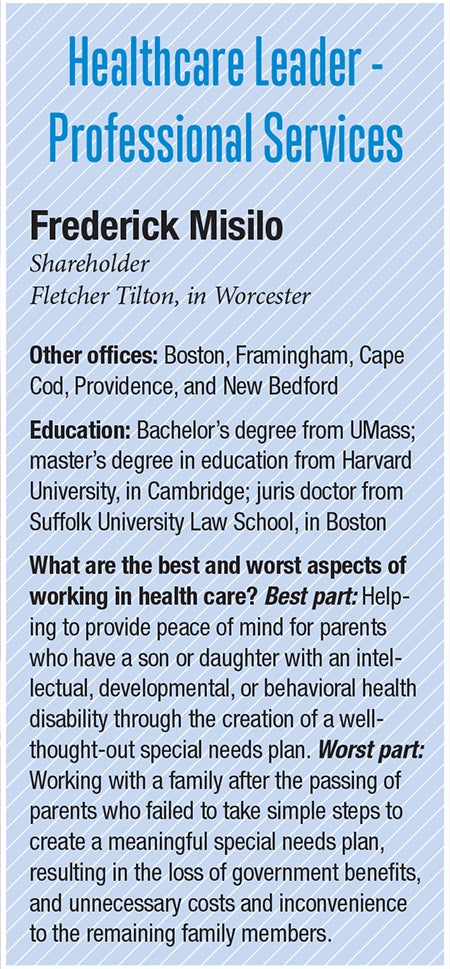 Misilo’s work brought him to the public sector; he served as deputy commissioner for the Massachusetts Department of Developmental Services during the Gov. Bill Weld Administration. For the past 28 years, he has worked at Fletcher Tilton, where he is chair of the firm’s trust and estate department. In the community, he serves as board chair for Worcester insurer Fallon Health.