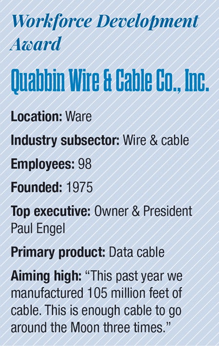 But while the kind of wires the company makes have become essential for daily life in the modern world, it can still be a challenge to find the right people with the right skills to keep operations running, a struggle manufacturers face regardless of what they produce. So, about five years ago, Quabbin took matters into its own hands: The firm hired a training coordinator to develop and implement a standardized educational program for its new hires.