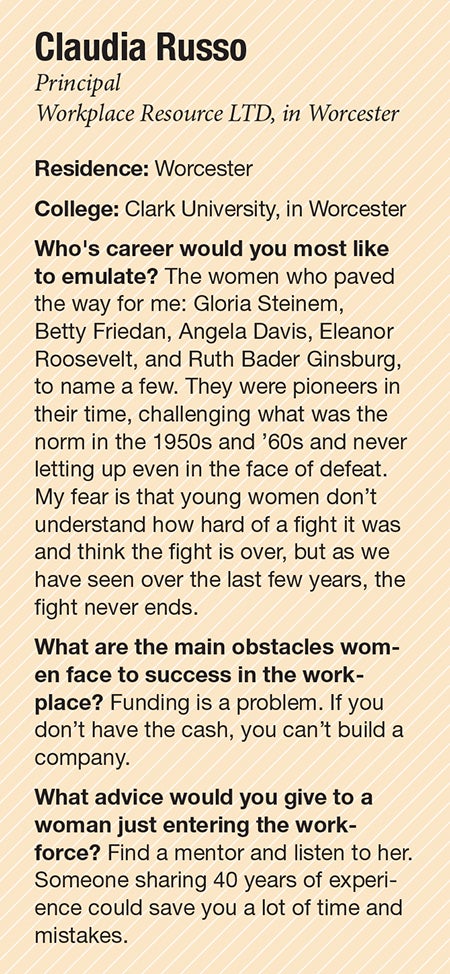 Sure enough, she soon found out some of her male counterparts were making around $250,000, so she began to look around for a commissioned-sales job. She climbed the ranks to a management position at Creative Office Pavilion, a Boston-based firm with an office in Worcester. Of the 12 people on the management team, Russo was the only woman.