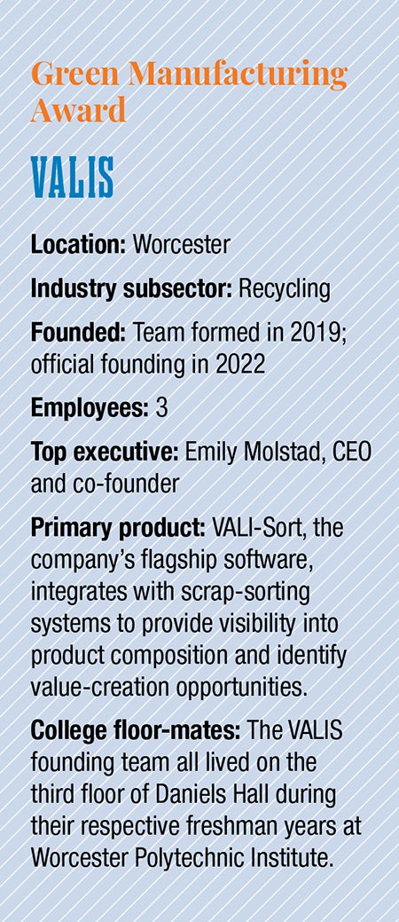 VALIS does not manufacture anything. Instead, the Worcester-based startup, which grew out of an idea at Worcester Polytechnic Institute and the Leominster research-and-development company Solvus Global, gives recycling factories solutions by offering them proprietary software to help them make decisions and provide solutions about what to do with the materials those recyclers have collected.