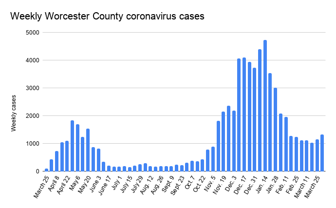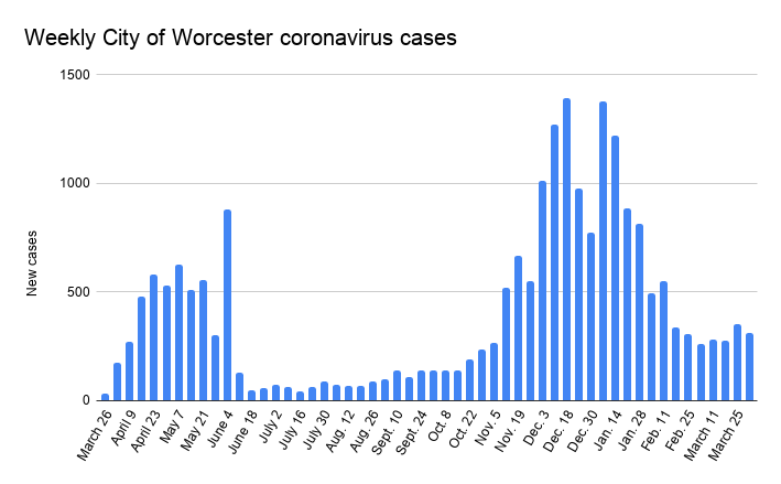 City officials in Worcester reported 311 new weekly cases, roughly in line with numbers Worcester’s had since mid-February. The city has had 22,011 cases reported since the pandemic began.