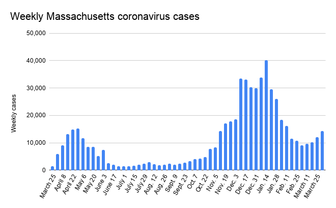 New totals reported by the city and the Massachusetts Department of Public Health come the same week that U.S. Centers for Disease Control and Prevention Director Rochelle Walensky used the word “doom” to describe what she saw as a coming next wave of cases nationally. Vaccinations against COVID-19 have been rising, but so have numbers of virus variants spreading more easily. States have also loosened business capacity restrictions, including Massachusetts.
