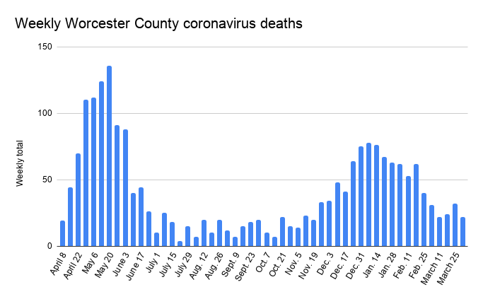 Worcester County had 22 newly reported deaths in the past week, bringing its total to 2,155.
