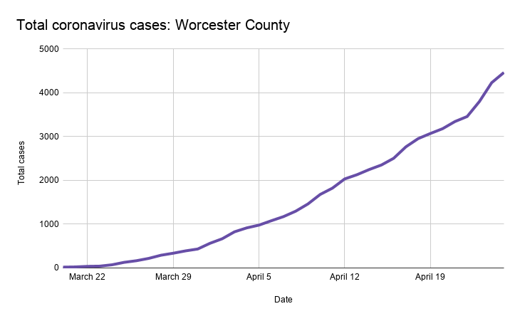 After Friday’s huge increase in cases, new cases Saturday rose 6% in one day, bringing Worcester County’s tally to 4,460. Total cases statewide rose by 2,379, or 5%, bringing confirmed cases to 53,348.