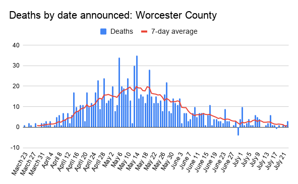 Worcester County had a reported 234 new coronavirus cases and six fatalities between July 17 and Thursday, according to the Massachusetts Department of Public Health.