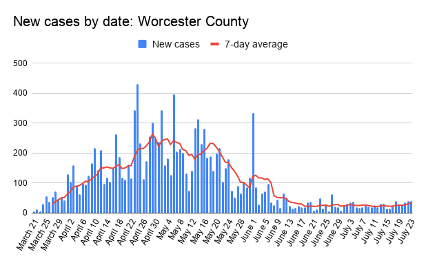 The new cases in Worcester County increase the total to 12,972 since the beginning of the coronavirus pandemic. Across Massachusetts, confirmed and probable cases increased by 2,066 between July 17 and Thursday, bringing the total to more than 115,000 since the pandemic began. Of those, there were 1,412 confirmed, and 654 probable cases recorded.
