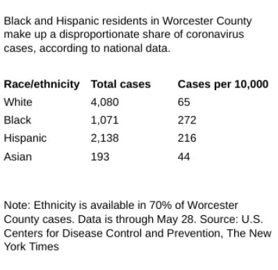 Black and Hispanic residents in Worcester County have been infected by coronavirus at proportions multitudes higher than white residents, according to data from the U.S. Centers for Disease Control and Prevention.