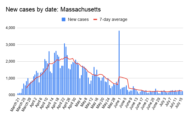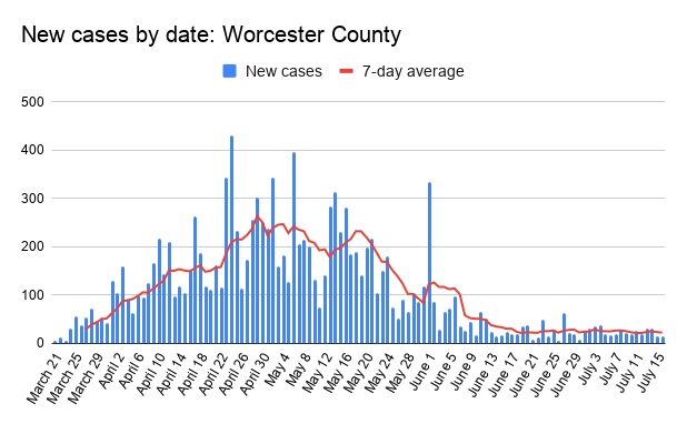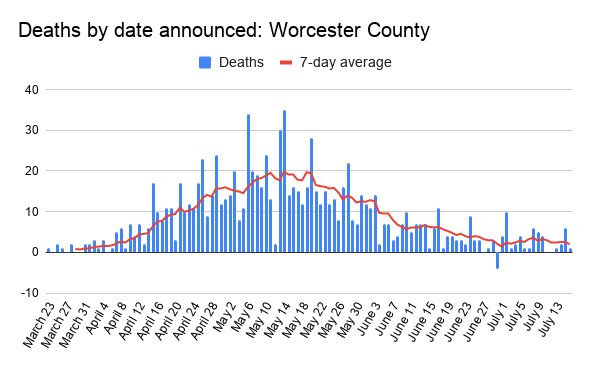 Fatalities in Worcester County between July 10 and Thursday bring the death toll to 968. July 11 and July 12 were the first two days since March that two consecutive days passed with no new deaths.